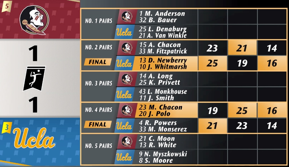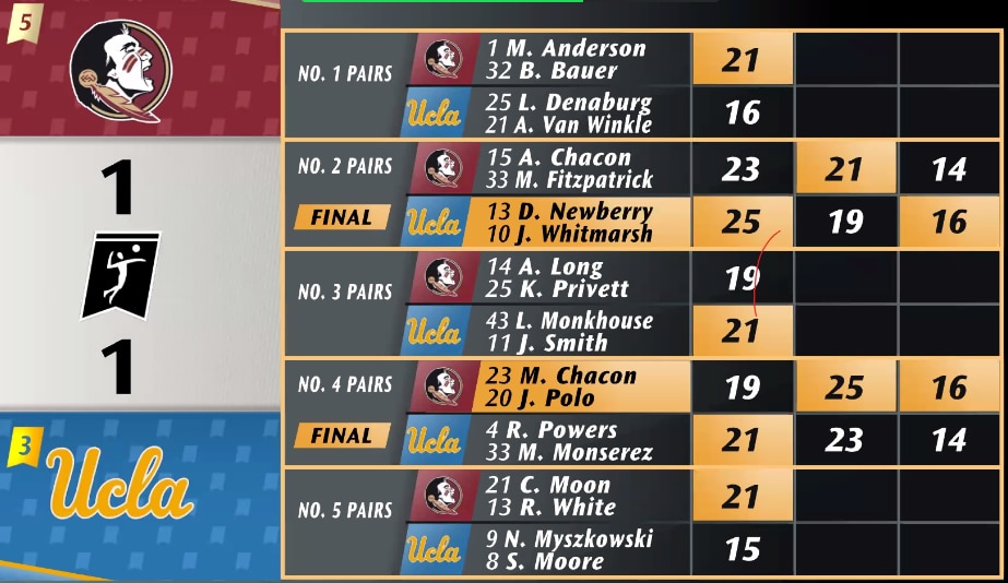 It all comes down to the match between the No. 1 pairs in the third set. FSU's Maddie Anderson and Brooke Bauer won the first set 21-16, but UCLA's Lexi Denaburg and Abby Van Winkle won the second set on their third set-point opportunity. The two pairs will play to 15 to decide a winner