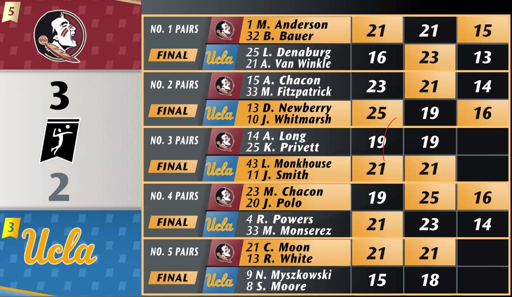 It all came down to the final set in matchup between the No. 1 pairs of FSU's Brooke Bauer and Maddie Anderson against UCLA's Abby Van Winkle and Lexy Denaburg. The Bruins were down to their last chances in the second set as the Seminoles were looking to close out. But, after three set-point chances, UCLA was able to win 23-21 and force a third set.