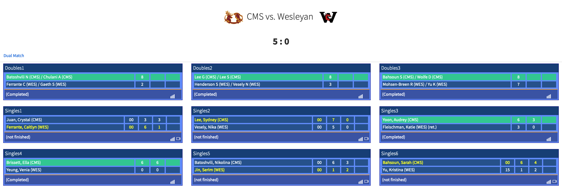 Below you can find the final scores of each doubles & singles match:
