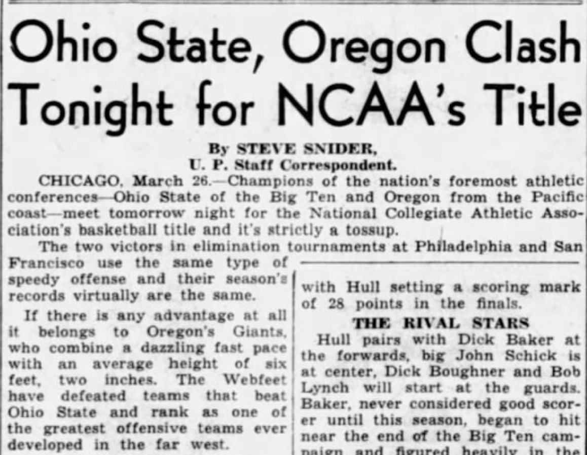 In the March 28 edition of The Evening Herald (Klamath, Ore.) that recapped Oregon's national championship victory over Ohio State, the newspaper noted, "the Webfoots brought their height and uncanny one-handed shooting into play again."