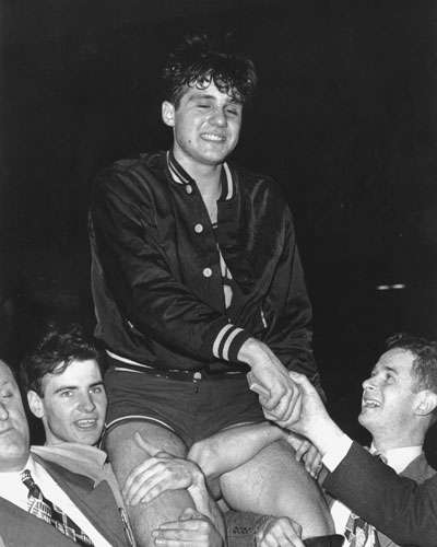 George Kaftan of Holy Cross is carried off the court after defeating Oklahoma, 58-47, for the title.