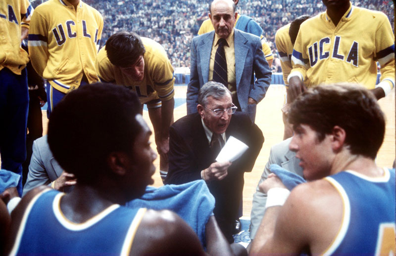 UCLA coach John Wooden talks to his team at the Final Four. The Bruins beat Memphis State to win another championship.