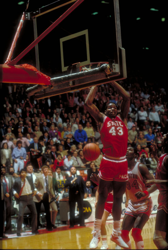 North Carolina State's Lorenzo Charles (43) jams the ball in the hoop while Houston's Akeem Olajuwon (34) watches.
