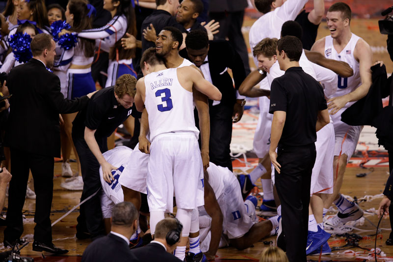 Duke players pile up after winning the 2015 NCAA Men's Division I Championship game.