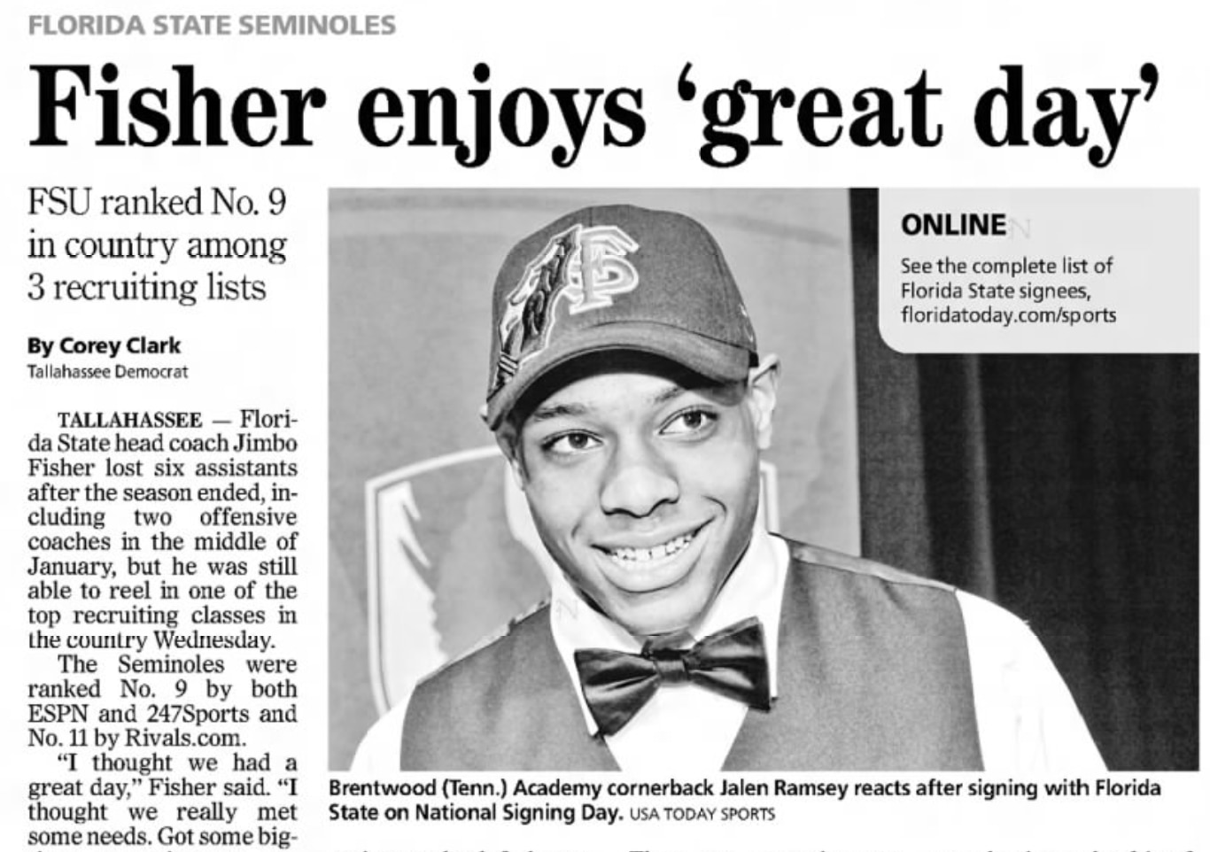 The addition of Ramsey to Florida State's 2013 recruiting class helped it reach the top 10 in many rankings. "The Seminoles finished with such a strong ranking after landing five-star prospects Matthew Thomas and Jalen Ramsey late in the recruiting process," reported South Florida Sun Sentinel's Coley Harvey in February 2013.