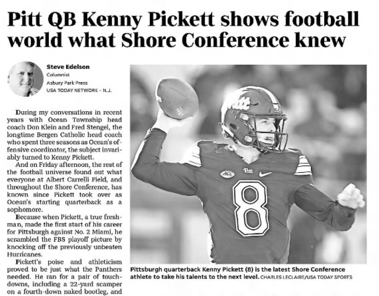 Asbury Park Press columnist Steve Edelson after Pitt beat No. 2 and previously undefeated Miami in November 2017: "And on Friday afternoon, the rest of the football universe found out what everyone at Albert Carrelli Field, and throughout the Shore Conference, has known since Pickett took over as Ocean's starting quarterback as a sophomore. Because when Pickett, a true freshman, made the first start of his career for Pittsburgh against No. 2 Miami, he scrambled the FBS playoff picture by knocking off the previously unbeaten Hurricanes. Pickett's poise and athleticism proved to be just what the Panthers needed. He ran for a pair of touchdowns, including a 22-yard scamper on a fourth-down naked bootleg, and threw for another score, a 6-yard shovel pass in the final minute of the second quarter that put the Panthers up 10-7 at halftime. In all, Pickett completed 18 of 29 passes for 193 yards, while rushing for a team-high 60 yards."