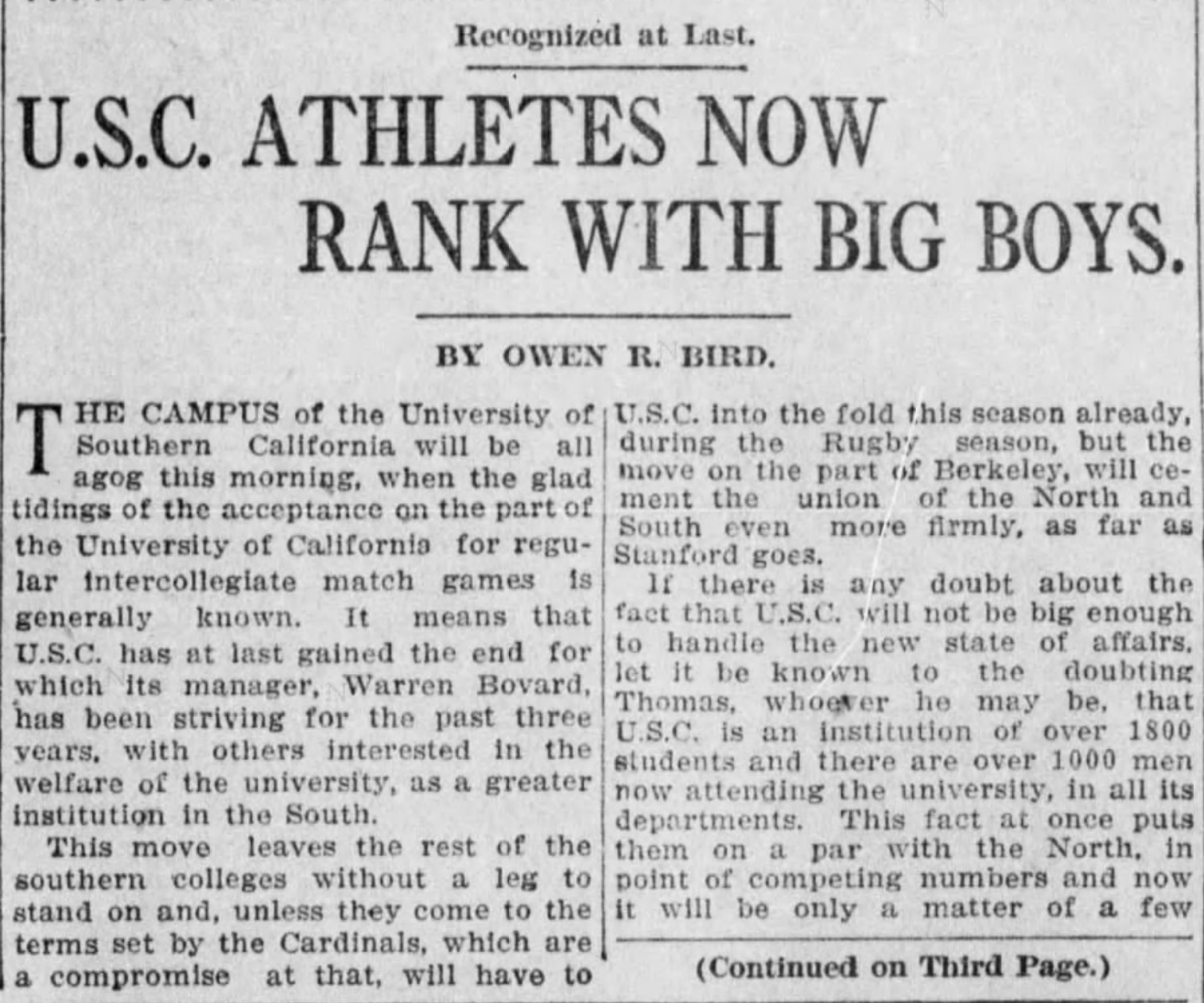 The story, which was written by Bird, detailed how Southern California had finally gotten the University of California to agree to regular athletic competition, to which Bovard "has been striving for the past three years."