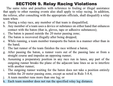 "A member of a relay team may not run outside the passing zone for the purpose of taking the baton from a faltering or fallen teammate."