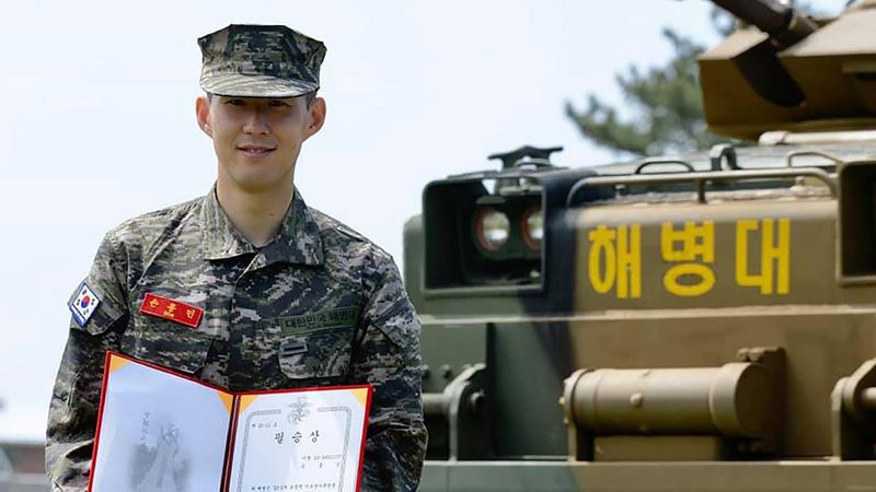 South Korea's marine corps posted pictures of Son wielding an M-16 assault rifle and saluting on their Facebook page as he completed his stint at a boot camp.