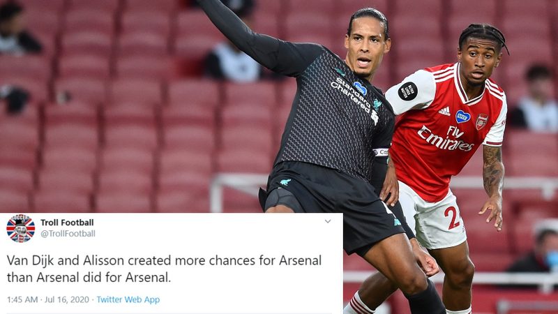 Arsenal held on to their gifted lead for the rest of the night, beating Liverpool and ending the Reds�?hopes of breaking Manchester City's record of 100 points in a Premier League season. The internet was unforgiving of Van Dijk and Alisson for their error and here are some of the best reactions: