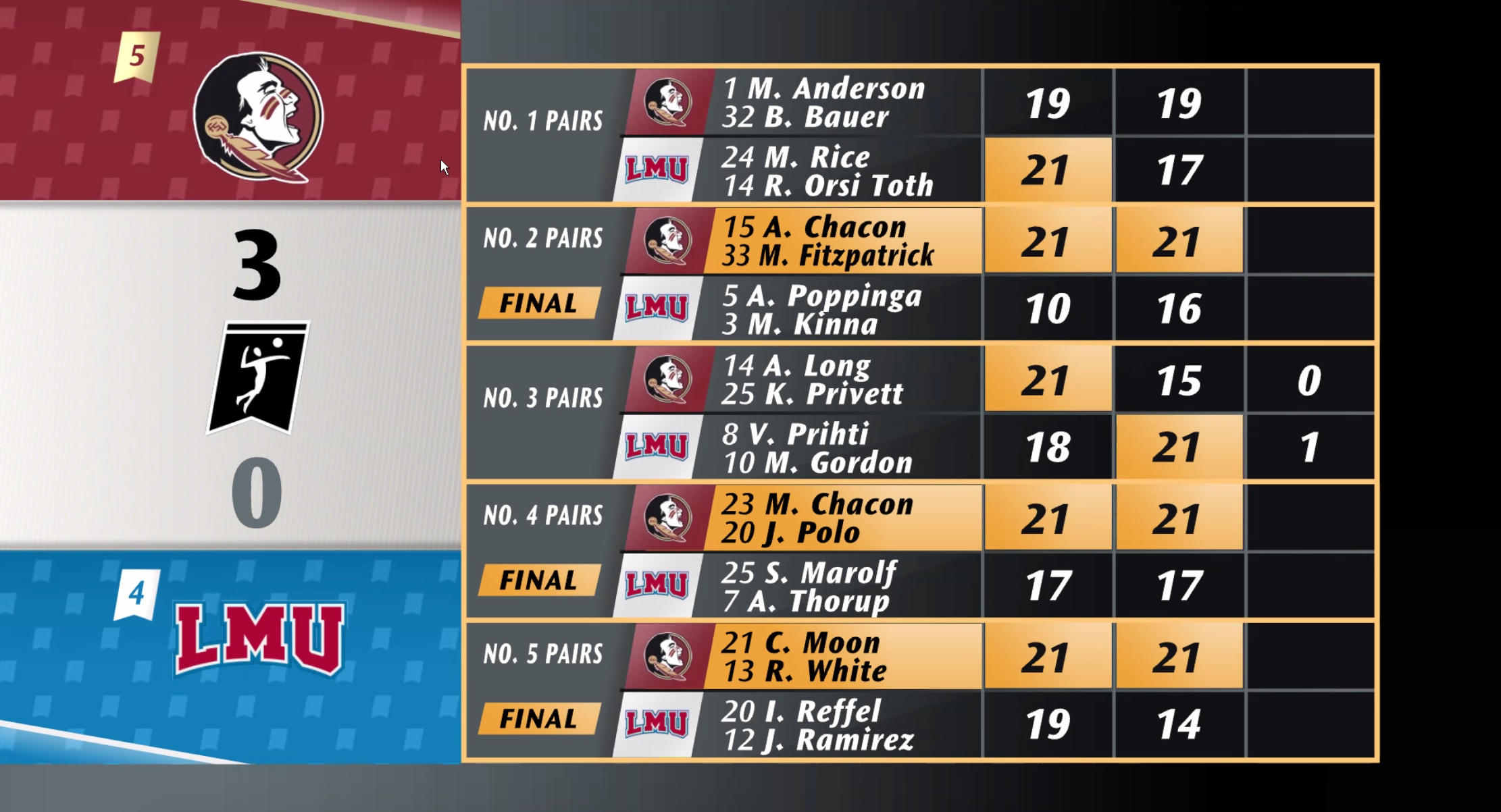 The remaining three courts were more tightly contested, but it was Caitlin Moon and Raelyn White on Court 5 who secured the win for Florida State, taking down LMU's Isabelle Reffel and Jacinda Ramirez 21-19, 21-14.