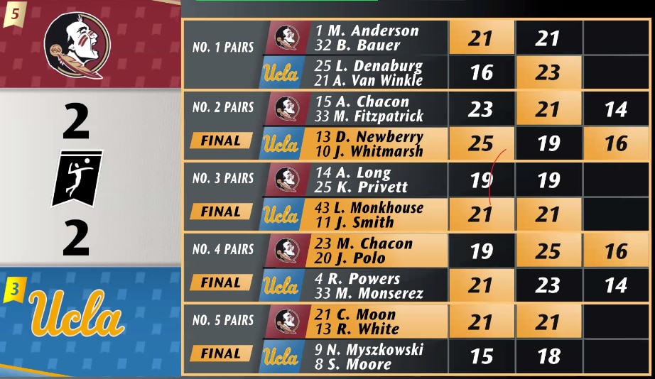 It all comes down to the match between the No. 1 pairs in the third set. FSU's Maddie Anderson and Brooke Bauer won the first set 21-16, but UCLA's Lexi Denaburg and Abby Van Winkle won the second set on their third set-point opportunity. The two pairs will play to 15 to decide a winner