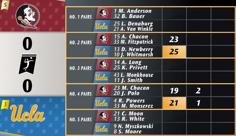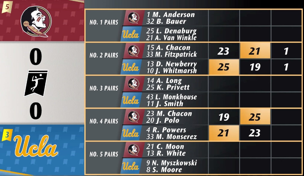 It all came down to the final set in matchup between the No. 1 pairs of FSU's Brooke Bauer and Maddie Anderson against UCLA's Abby Van Winkle and Lexy Denaburg. The Bruins were down to their last chances in the second set as the Seminoles were looking to close out. But, after three set-point chances, UCLA was able to win 23-21 and force a third set.