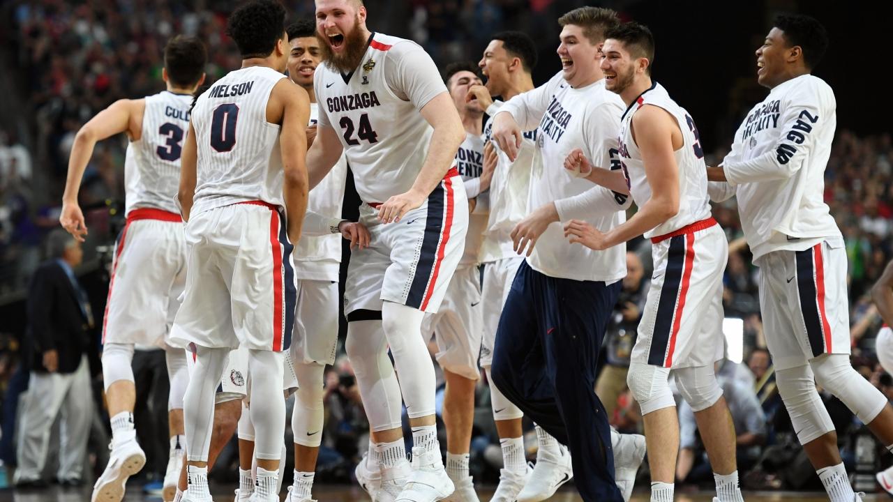 Przemek Karnowski (24) and Gonzaga celebrates their first title game berth in program history.