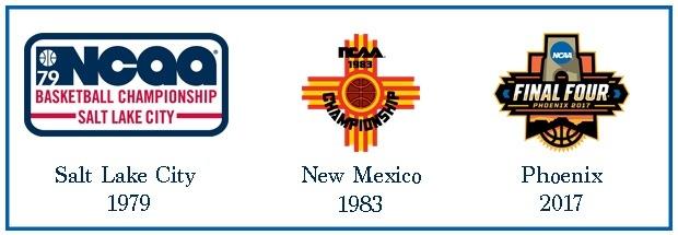 We end here with the southwest, a region that is often colored with a variety of red clay-and-turquoise color palettes. And yet in the first logo of this trio, the first customized logo in Final Four history, Salt Lake City gets a ... red, white, and blue look! To be fair, Salt Lake City isn't your prototypical southwest location, but still, this logo looks nothing like what would come next. It's very reminiscent of the soft, rounded edges Montreal used for the 1976 Olympics.