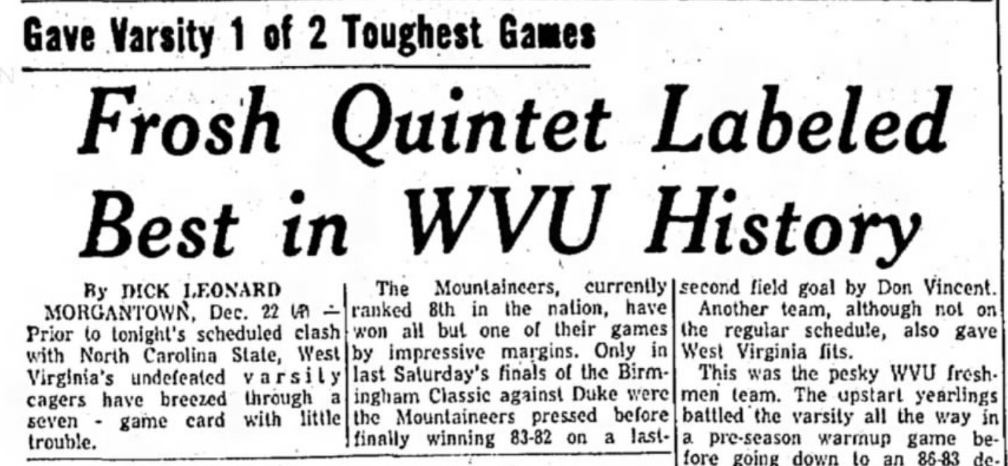 With West, the Mountaineers' freshmen were so impressive that they challenged the school's varsity team before falling 86-83 in a preseason exhibition. The varsity went on to be a top-10 team that season, while West helped West Virginia's freshman team to its first-ever undefeated season during the 1956-57 campaign.