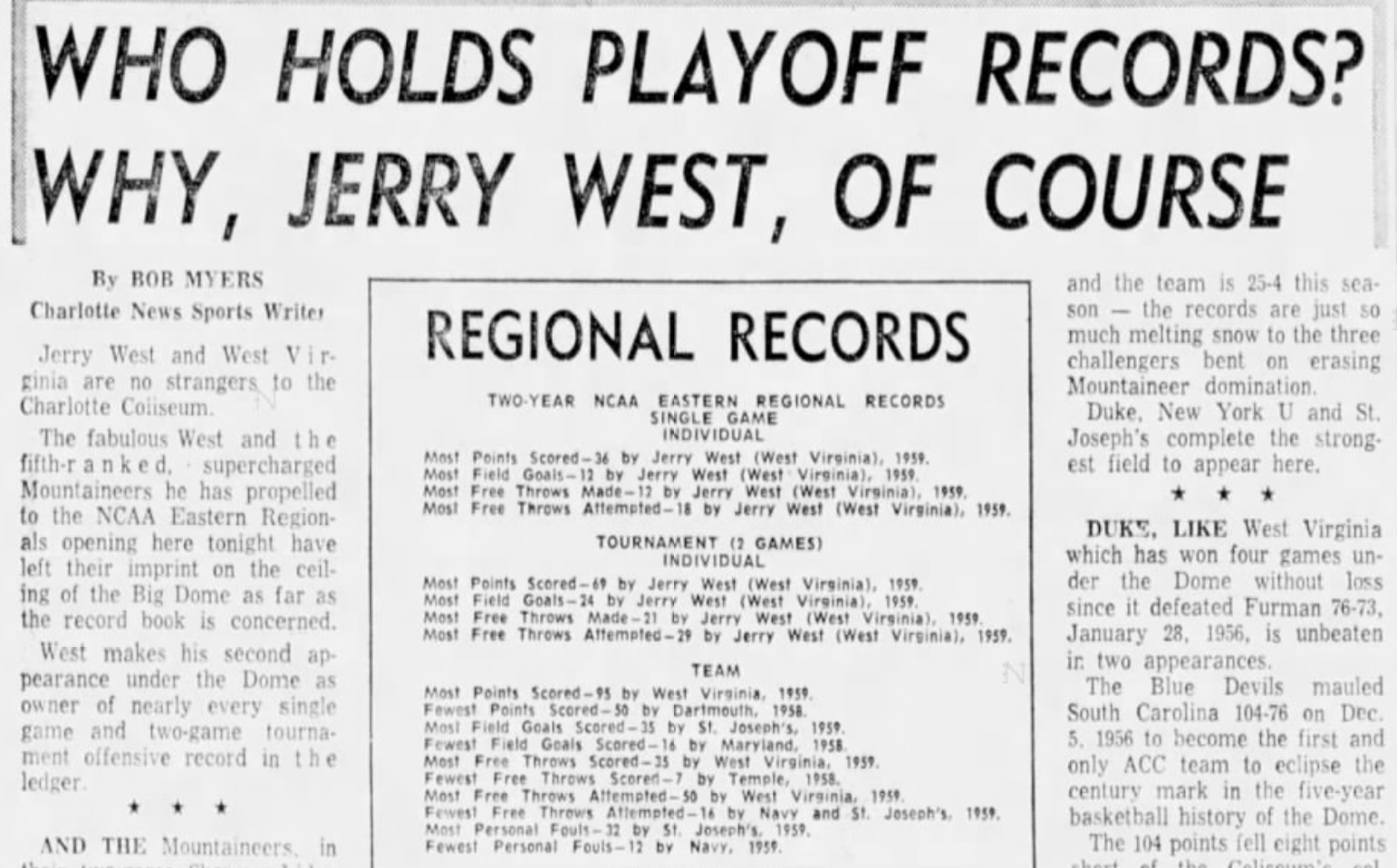 The Greenville News' Jim Anderson: "Assistant Coach Roy Lester of Maryland, who is from West Virginia and was a three-sport letterman with the Mountaineers in the early '40s, told your correspondent this fall there is a freshman at Morgantown who 'will be even better than (West Virginia All-American Hot Rod) Hundley.' The freshman is Jerry West, 6-3, from East Bank, W. Va."