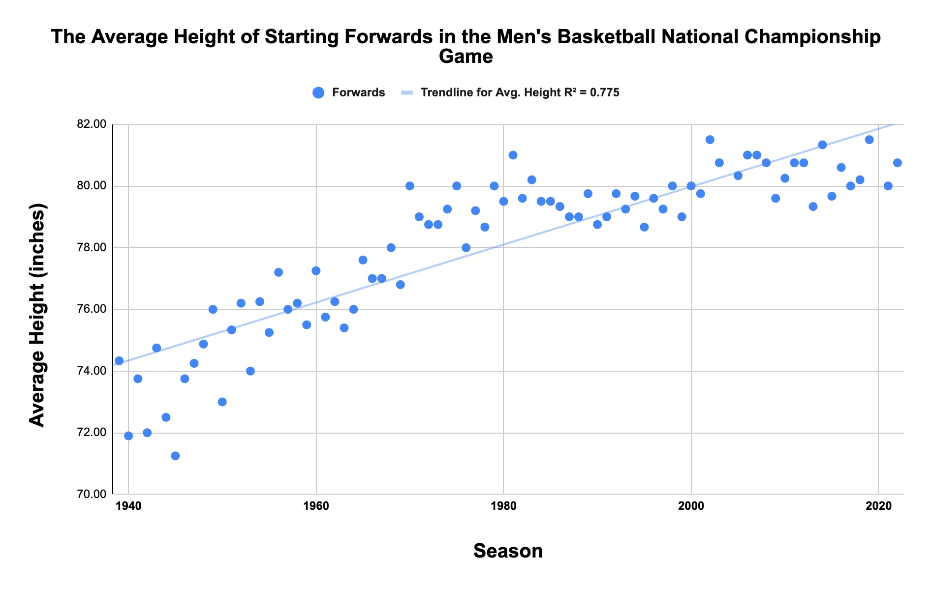 A given men's basketball season can explain roughly 78 percent of the variance in the height of starting forwards in the men's basketball national championship game.
