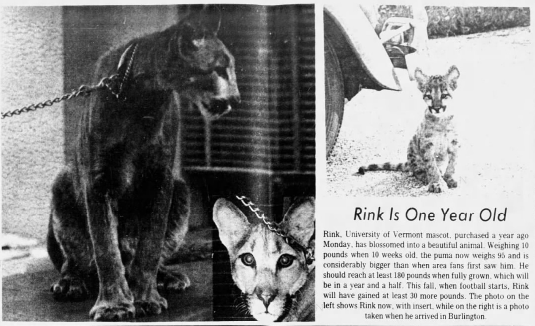 Below is an excerpt from The Burlington Free Press on March 11, 1969, when Rink turned one-year-old. "He should reach at least 180 pounds when fully grown, which will be in a year and a half," the newspaper reported. By October 1970, he weighed 150 pounds, according to The Burlington Free Press.
