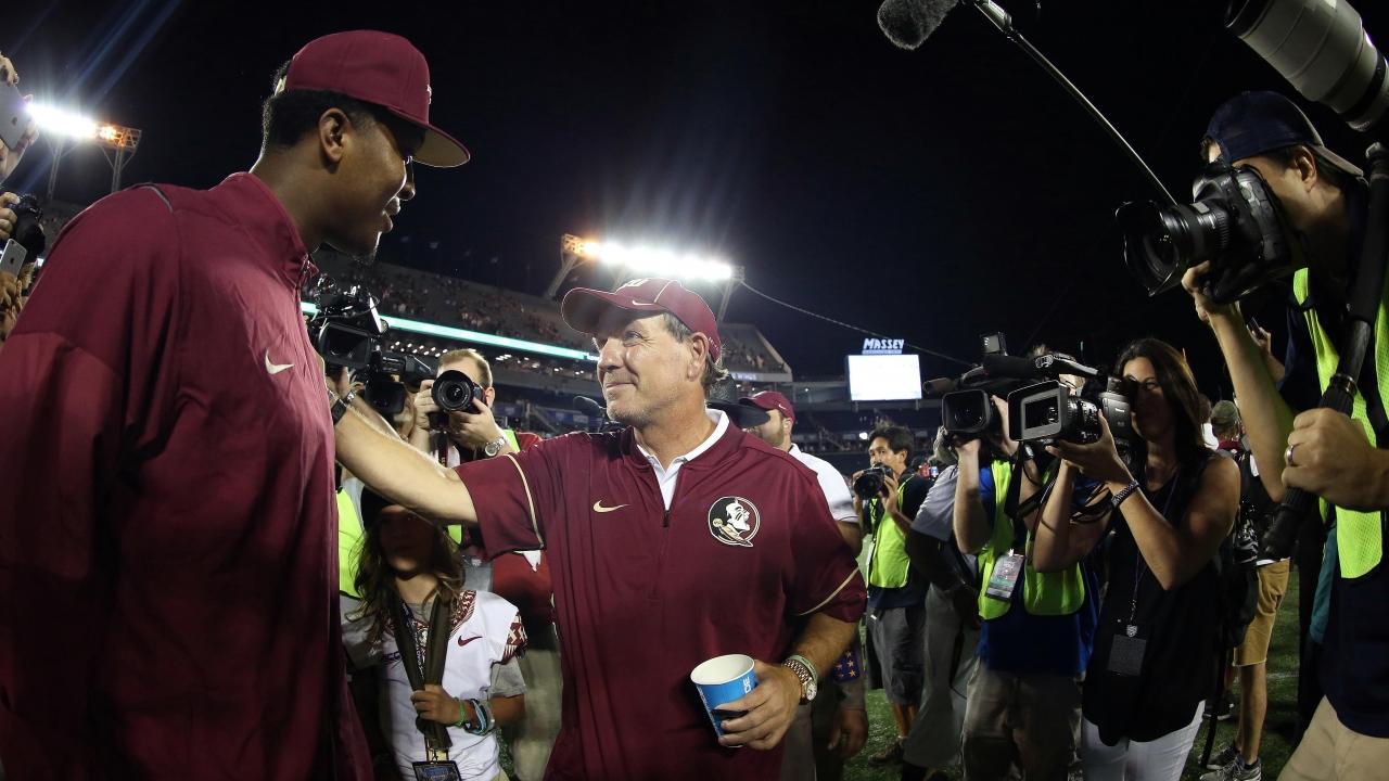 Florida State head coach Jimbo Fisher (right) greets former QB Jameis Winston after FSU defeated Ole Miss.
