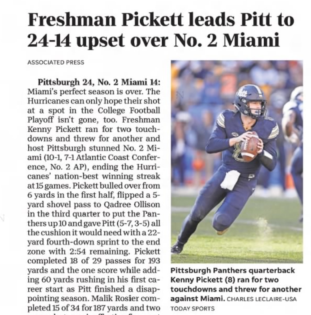 Asbury Park Press columnist Steve Edelson after Pitt beat No. 2 and previously undefeated Miami in November 2017: "And on Friday afternoon, the rest of the football universe found out what everyone at Albert Carrelli Field, and throughout the Shore Conference, has known since Pickett took over as Ocean's starting quarterback as a sophomore. Because when Pickett, a true freshman, made the first start of his career for Pittsburgh against No. 2 Miami, he scrambled the FBS playoff picture by knocking off the previously unbeaten Hurricanes. Pickett's poise and athleticism proved to be just what the Panthers needed. He ran for a pair of touchdowns, including a 22-yard scamper on a fourth-down naked bootleg, and threw for another score, a 6-yard shovel pass in the final minute of the second quarter that put the Panthers up 10-7 at halftime. In all, Pickett completed 18 of 29 passes for 193 yards, while rushing for a team-high 60 yards."