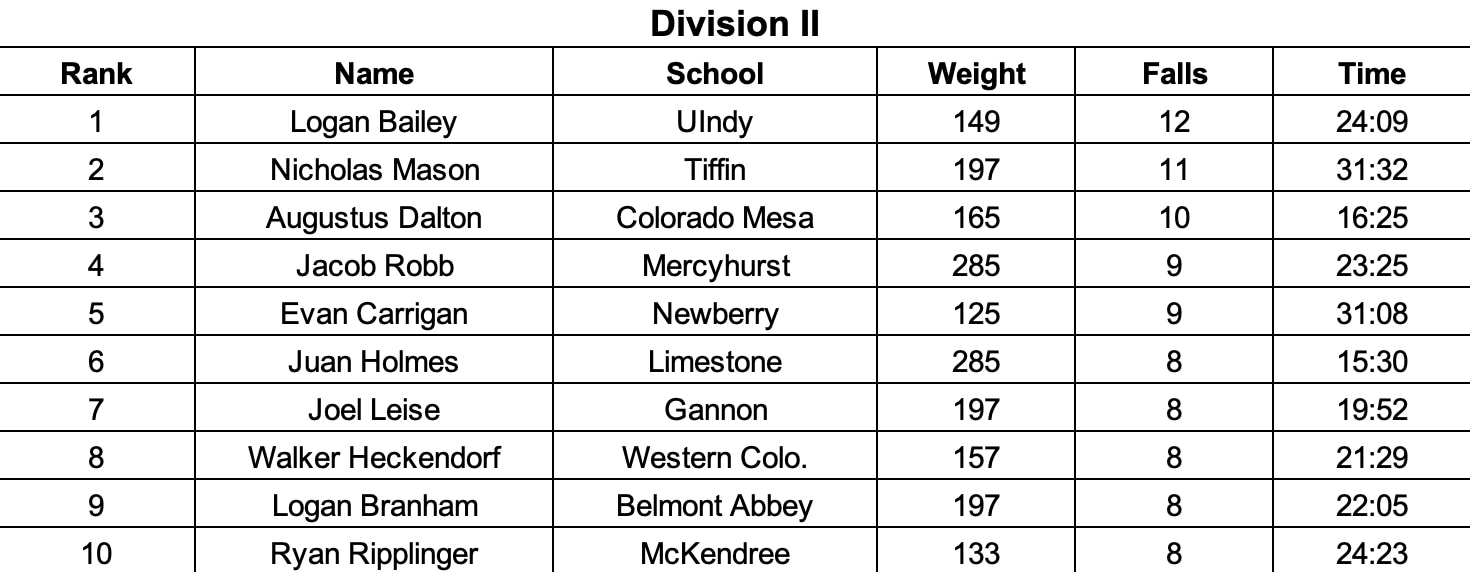 UIndy 149-pounder Logan Bailey notched another fall and now has the sole lead in Division II with 12 falls, one more than Tiffin’s Nicholas Mason and two more than Augustus Dalton of Colorado Mesa.